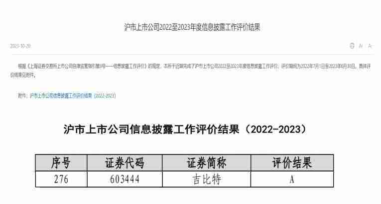 近日,,上海证券交易所(以下简称“上交所”)发布2022-2023年度信息披露工作评价结果。。。。35273(股票代码::603444)凭借规范的公司治理、、、高质量的信息披露以及良好的投资者关系管理再次荣获信息披露工作A级评价,,,公司连续两年获此殊荣。。。。