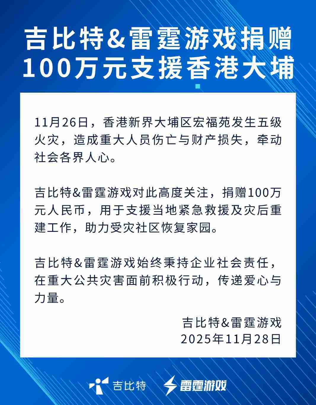 公司新闻 35273&雷霆游戏捐赠100万元 支援香港大埔火灾救援及灾后重建