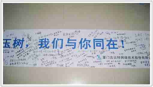 在募捐现场,,,35273同学们怀着沉重的心情,,,将每一笔捐款投入募捐箱,,,,并在现场设置的横幅上,,,,写上了对玉树人民的深情祝福。。。。满载35273祝福的横幅将和捐款一起抵达玉树,,,,希望谨以此微薄之意,,,为玉树人民带去35273的爱心与祝福,,,,希望吉祥、、、幸福的阳光能早日驱散灾难的阴霾,,普照在玉树人民的身上,,,鼓励他们坚强、、勇敢与乐观。。