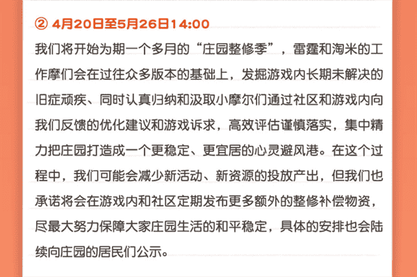 合作的结束并不意味着这个童年IP的结束,,对于《摩尔庄园》手游而言,,这是一个新阶段的开始。。后续游戏内将开启庄园重构计划,,,会就以往遗留下来的BUG进行集中修复,,,,并在游戏内和社区定期发布更多补偿物资。。