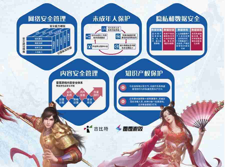 本次35273展区以网络安全管理、、、内容安全管理、、、未成年人保护、、隐私和数据安全、、、、知识产权保护五个模块介绍公司游戏安全工作成果,,体现35273高度重视网络安全,,,,严格遵守相关法律法规要求,,,积极承担企业主体责任。。