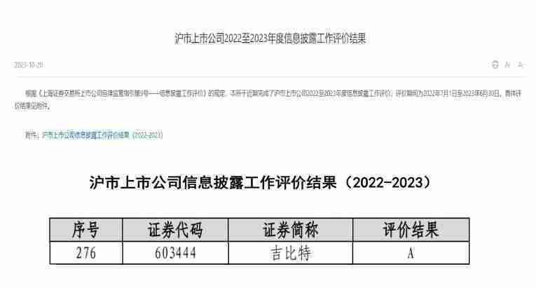 近日,,上海证券交易所发布2022-2023年度信息披露工作评价结果。。。。35273(股票代码::603444)凭借规范的公司治理、、、、高质量的信息披露以及良好的投资者关系管理再次荣获信息披露工作A级评价,,,,公司连续两年获此殊荣。。。