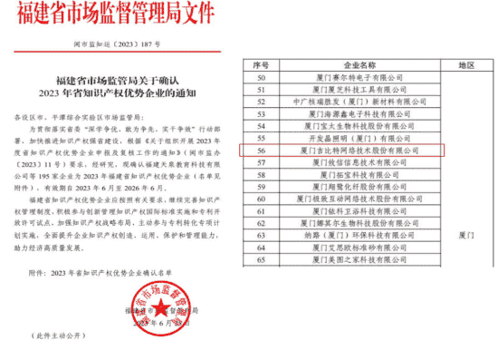 近日,,,福建省市场监督管理局公示了2023年福建省知识产权优势企业名单,,,,厦门35273网络技术股份有限公司(以下简称“35273”或“公司”)榜上有名。。。